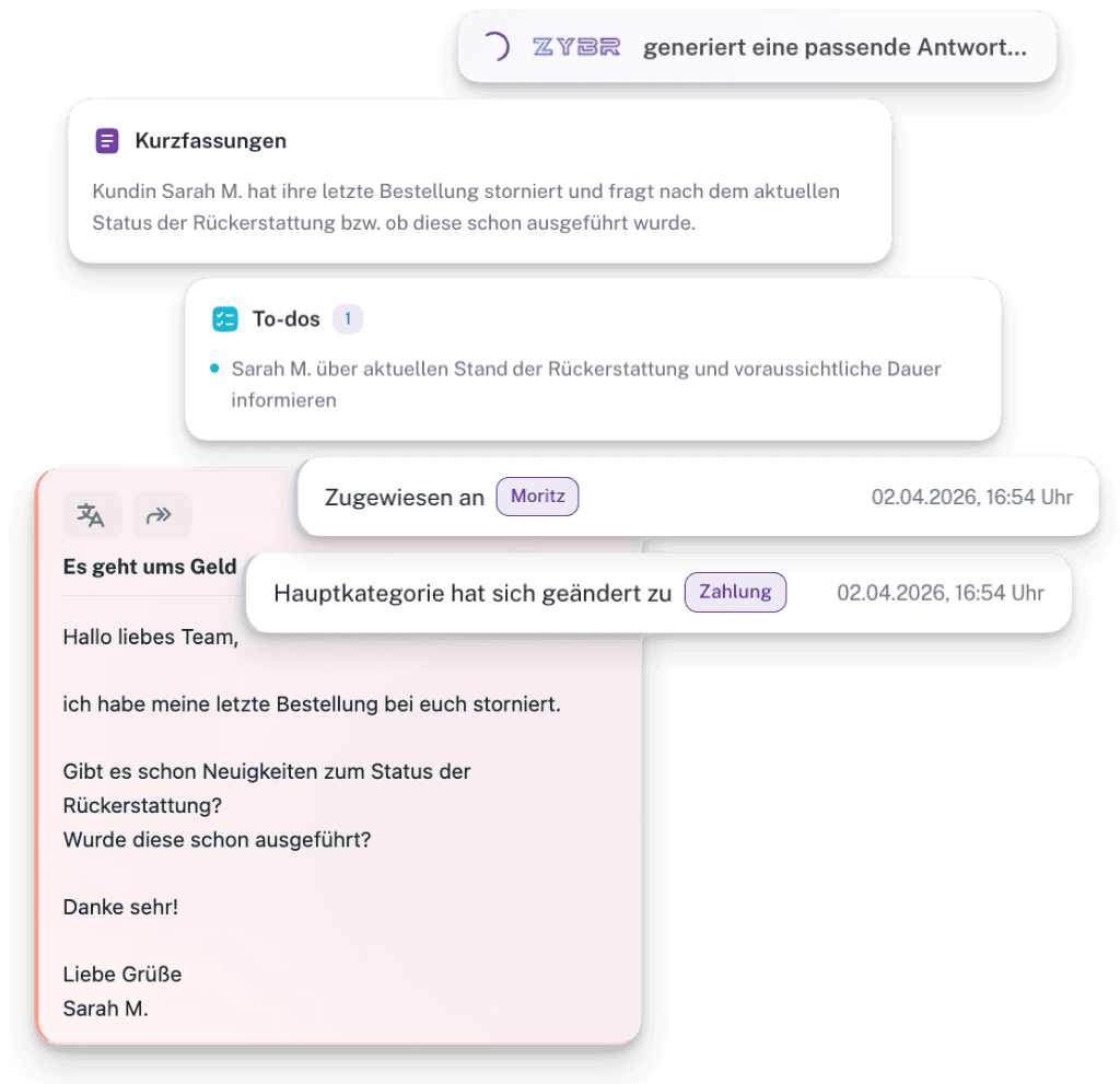 ZYBR geht viele Schritte weiter: ein KI-Helpdesk für Shopify-Shops, der deinen Kundenservice mit KI automatisiert, dabei bis zu 70% der Kundenanfragen eigenständig beantwortet, diese auch bis ins Detail versteht, priorisiert und individuell reagiert.
