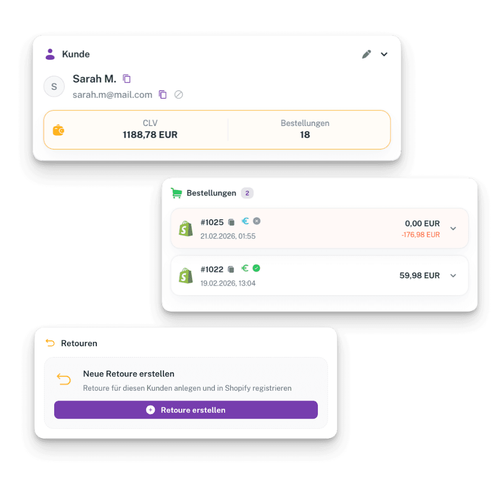 Alle Bestell-, Kunden- und Versanddaten sind ohne Tab-Wechsel oder Copy-Paste live im Ticket verfügbar. So erledigst du Stornos, Rückerstattungen und Nachforschungen in Sekunden.